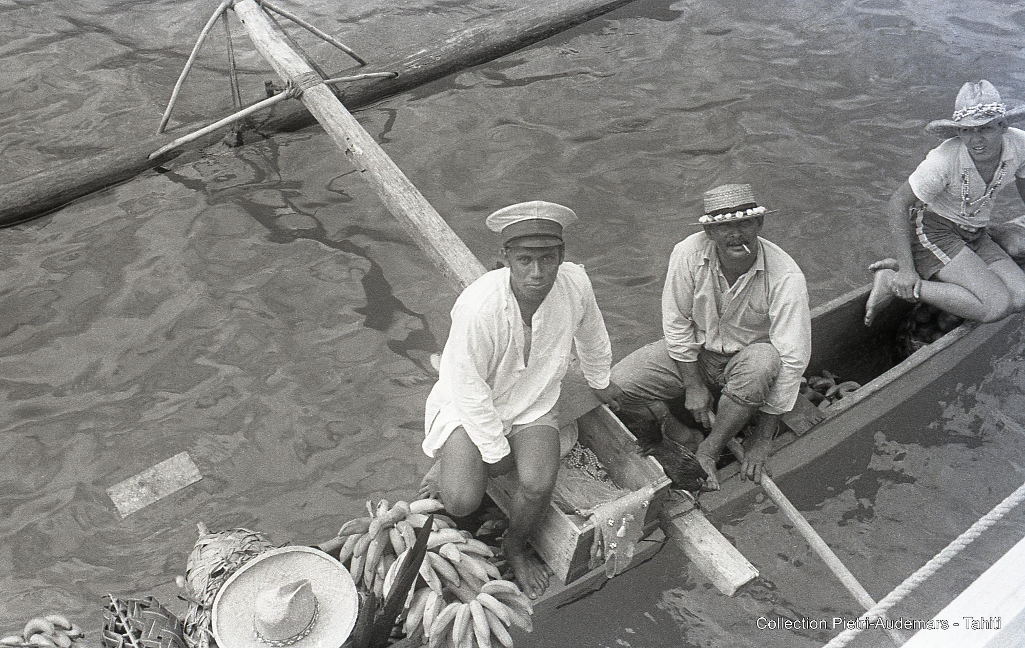 Sujet : Vendeurs sur pirogue auprès de l’équipage du Dunedin à Bora Bora. Croiseur léger de classe Danae construit pour la Royal Navy dans les années 1910, le navire est rattaché à la division neo-zélandaise de la Royal Navy et patrouille dans le Pacifique. Il rejoint l’Angleterre en 1937 et sera torpillé et coulé par un sous-marin allemand en 1941. Il n’y aura que 67 survivants sur un équipage de 500 hommes. Adrien Audemars est de nationalité suisse et vient à Tahiti en 1936. Il y reste quelques mois puis repart en Europe, sans savoir qu’il a laissé une descendance sur l’île. Adrien l’apprend une trentaine d’années plus tard lorsque son fils part à sa recherche et le retrouve. Lors des retrouvailles, il confie à sa famille tahitienne plusieurs négatifs 24 X 36 de son séjour en Polynésie.